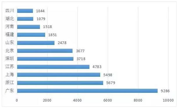 在各省、市、自治区中,注册招聘企业数量超过1000家的共有11个。其中,广东遥遥领先,高达9286家;浙江和上海接近,分别为5679家、5498家;江苏位居第四,为4783家;深圳、北京基本持平,分别为3718家、3677家;山东位居第七,为2478家;福建、河南、湖北、四川均在1000-2000家之间,不再一一列举。